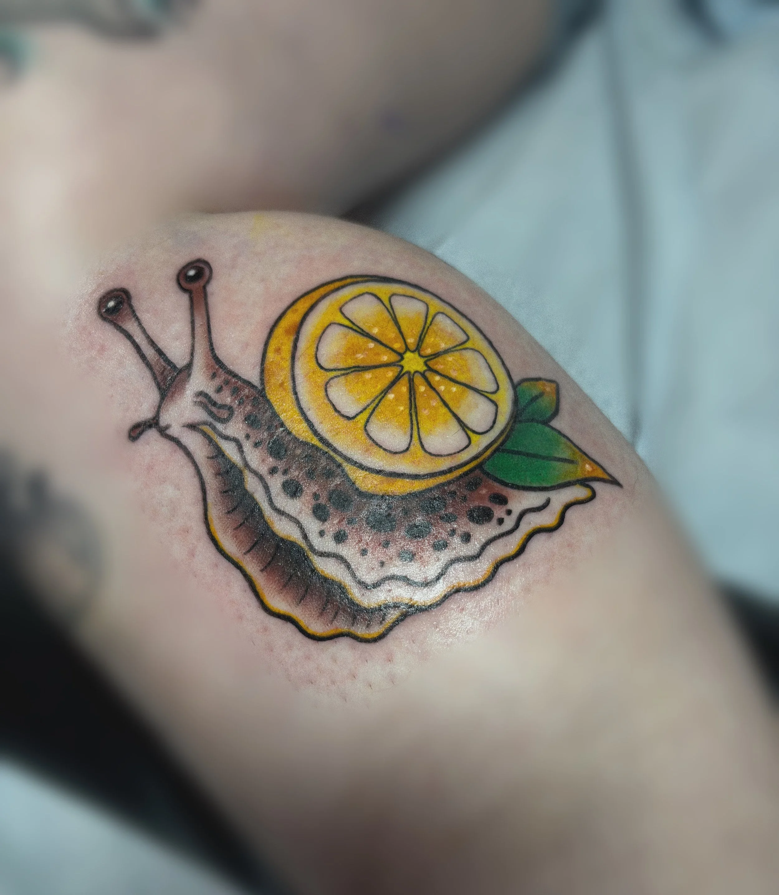 Tattoo of a snail carrying a lemon slice on its back, with green leaves, on a person's arm.