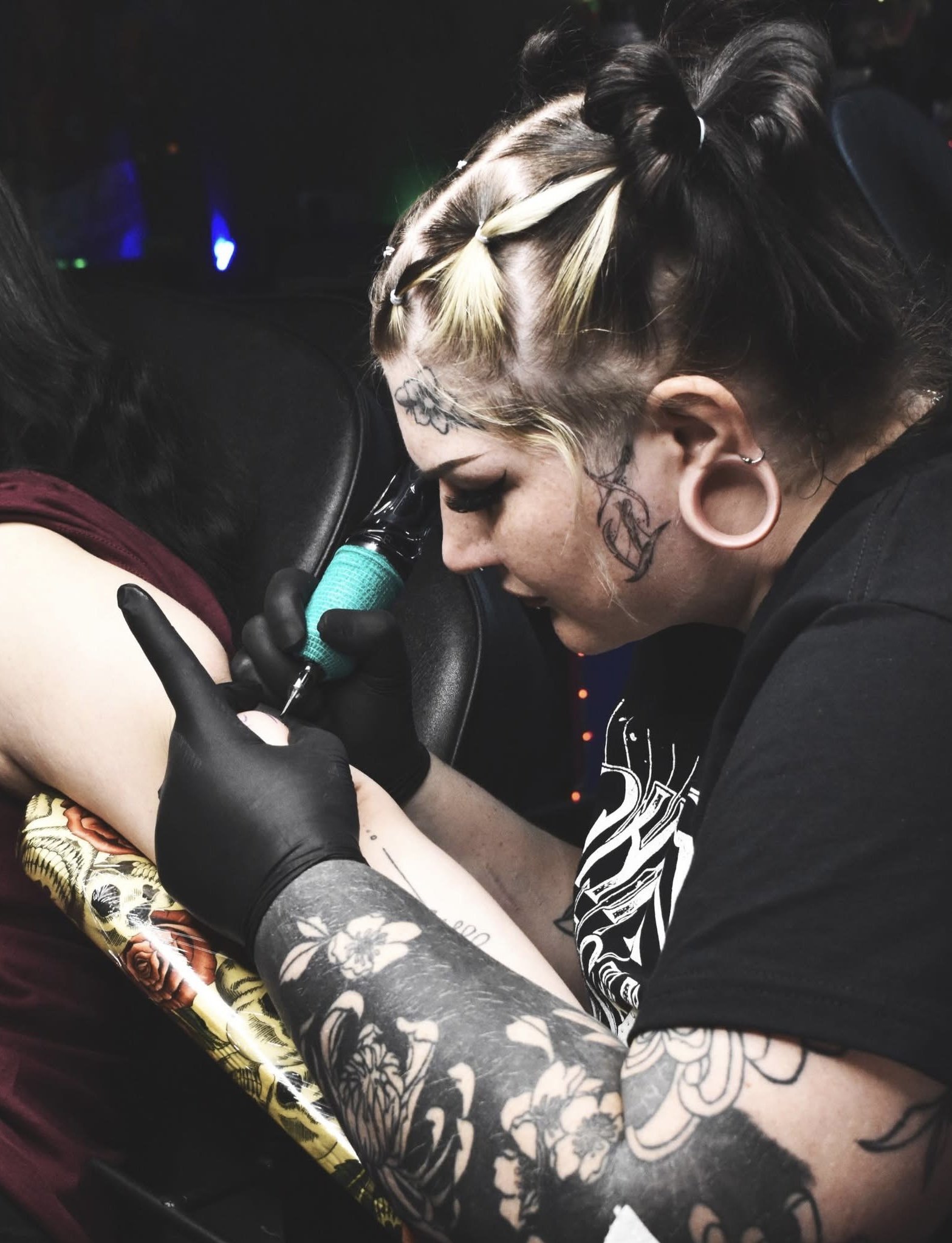 A tattoo artist with multiple tattoos and large gauge earrings is tattooing a person's arm in a tattoo shop. The artist is wearing black gloves and is focused on her work.